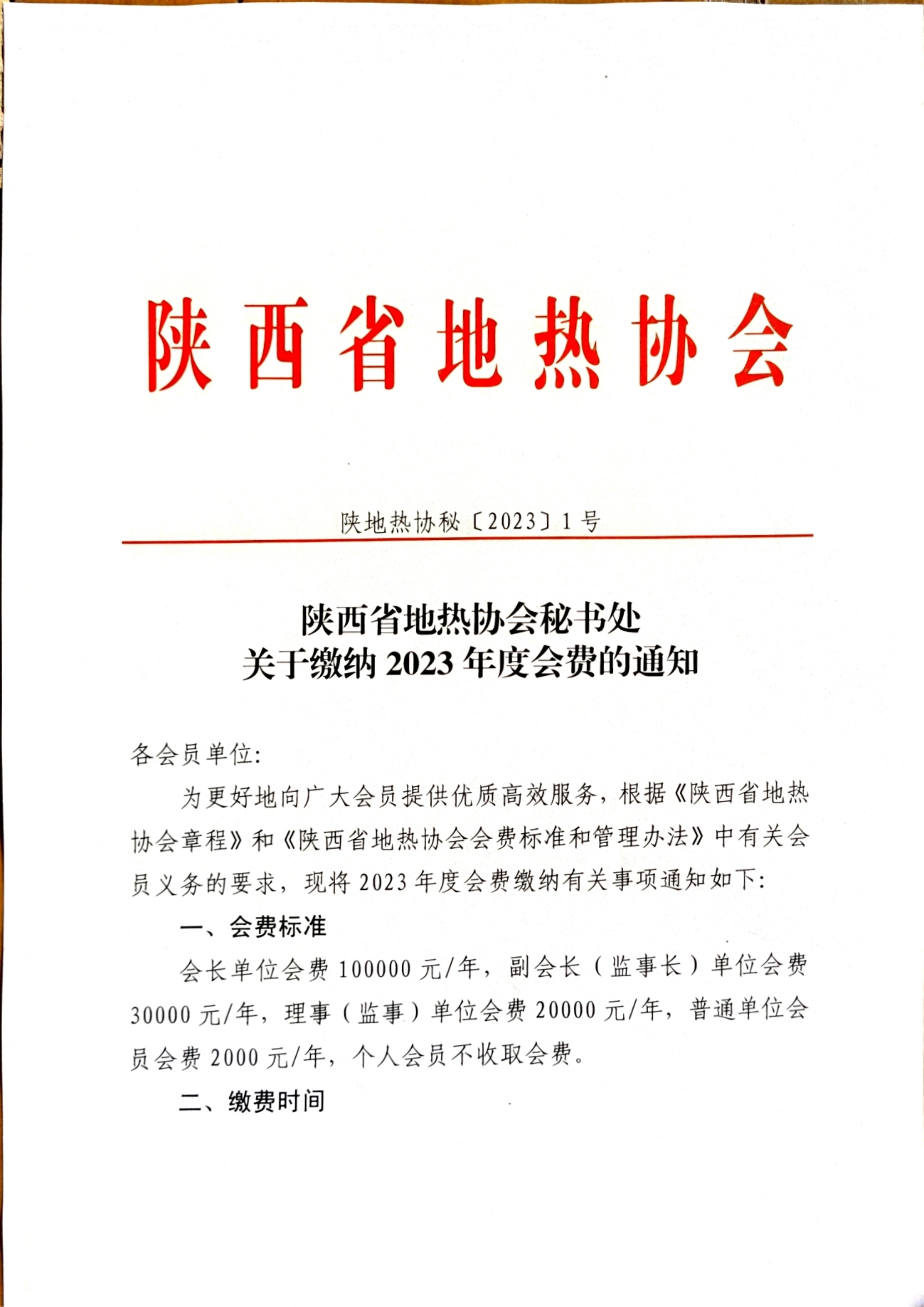 陕西省地热协会秘书处关于缴纳2023年度会费的通知